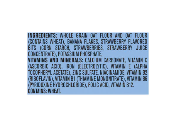 INGREDIENTS: WHOLE GRAIN OAT FLOUR AND OAT FLOUR (CONTAINS WHEAT), BANANA FLAKES, STRAWBERRY FLAVORED BITS (CORN STARCH, STRAWBERRIES, STRAWBERRY JUICE CONCENTRATE), POTASSIUM PHOSPHATE, NATURAL STRAWBERRY FLAVOR, VITAMINS AND MINERALS: CALCIUM CARBONATE, VITAMIN C (ASCORBIC ACID), IRON (ELECTROLYTIC), ZINC SULFATE, VITAMIN E (ALPHA TOCOPHERYL ACETATE), NIACINAMIDE, VITAMIN B2 (RIBOFLAVIN), VITAMIN B1 (THIAMINE MONONITRATE), VITAMIN B6 (PYRIDOXINE HYDROCHLORIDE), FOLIC ACID, VITAMIN B12.