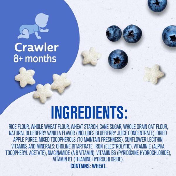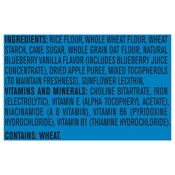 INGREDIENTS: RICE FLOUR, WHOLE WHEAT FLOUR, WHEAT STARCH, CANE SUGAR, WHOLE GRAIN OAT FLOUR, NATURAL BLUEBERRY VANILLA FLAVOR (INCLUDES BLUEBERRY JUICE CONCENTRATE), DRIED APPLE PUREE, MIXED TOCOPHEROLS (TO MAINTAIN FRESHNESS), SUNFLOWER LECITHIN,