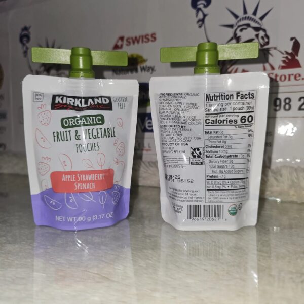 Be the first to review “Kirkland Signature Organic Fruit & Vegetable Pouches Flavor: Apple, Strawberry & Spinach – 90g” Cancel reply